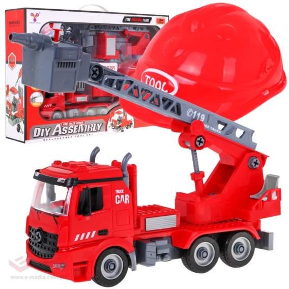 Dla tych chłopców, którzy marzą o tym by zostać strażakiem, mamy znakomity zestaw, auto strażackie 2w1 oraz kask. Zabawka przeznaczona jest dla dzieci od 3-go roku życia. Pojazd strażacki należy złożyć z części konstrukcyjnych, śrubki i narzędzia znajdują się w zestawie. Wóz posiada wymienny, rozsuwalny i obracany o 180 stopni podnośnik z koszem lub rozsuwalną i obracaną drabinę zakończoną armatką wodną, która naprawdę działa.