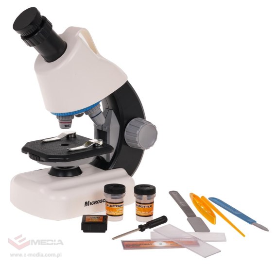 Mikroskop dla małego naukowca od 6-go roku życia. Mikroskop wykonany został z najlepszej jakości materiałów, umożliwia obserwację obiektów nawet w powiększeniu 1200 razy. W zestawie z mikroskopem znajdują się również akcesoria takie jak próbówki, gotowy preparat, 2 szkiełka do preparatu, pudełko na mikroorganizmy czy pęseta. Mikroskop zasilany jest bateriami typu 2 x AA 1,5 V (brak w zestawie).