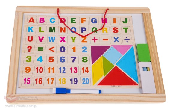 Drewniana, dwustronna tablica z akcesoriami dla dzieci od 3-go roku życia. Z jednej strony tablica jest czarna do malowania kredą, a z drugiej biała do pisania pisakami suchościeralnymi. W zestawie znajduje się również kreda, pisak suchościeralny, gąbka i magnesy z literkami i cyferkami oraz figury geometryczne.
