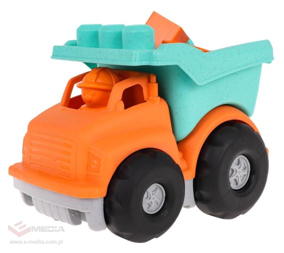 Wywrotka wykonana z bioplastiku i klocki, dla dzieci od 3-go roku życia. Eko-tworzywo jest bezpieczne dla dzieci i przyjazne dla środowiska. Wywrotka jest kolorowa, wytrzymała i odporna na uszkodzenia, posiada ruchome elementy. Przyczepę wywrotki można podnosić i opuszczać. Maluszek może również manualnie przesuwać pojazd po podłożu, dzięki dużym ruchomym kółeczkom. W zestawie z wywrotką znaleźć możemy również 7 klocków, również wykonanych z bioplastiku.