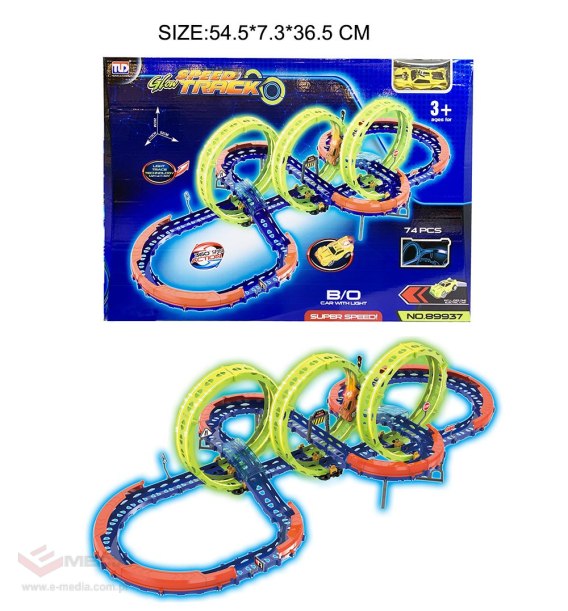 Duży, ekstremalny tor wyścigowy z ostrymi zakrętami, pętlami i autkiem to propozycja dla dzieci od 3-go roku życia. Zestaw składa się z 74 elementów do samodzielnego montażu. Na torze znajdują się odcinki proste, ostre zakręty z barierkami zabezpieczającymi przed wypadaniem pojazdu z trasy, dwa poziomy, a także trzy pętle 360 stopni. Pętle są fluorescencyjne, świecą w ciemności. Autko również posiada oświetlenie w tylnej części. Autko zasilane jest bateriami typu 2 x AA 1,5 V, baterii brak w zestawie.
