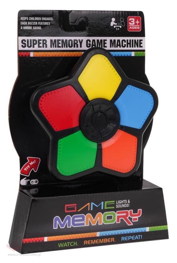 Ta popularna gra polega na powtarzaniu sekwencji wyświetlających się wcześniej kolorów. Grę rozpoczynamy po naciśnięciu dużego przycisku MEMORY znajdującego się na środku gry. Następnie komputer wskazuje - podświetla kolorowe pola, które należy odtworzyć. Z każdą sekwencją poziom trudności się zwiększa. W przypadku pomyłki słychać charakterystyczny dźwięk i grę należy rozpocząć na nowo. Dodatkowym atutem gry jest nieduża wielkość, dlatego można schować ją do kieszeni i zabrać ze sobą praktycznie wszędzie. Gra zasilana jest bateriami typu 2 x AA (baterie zostały dołączone do zestawu).