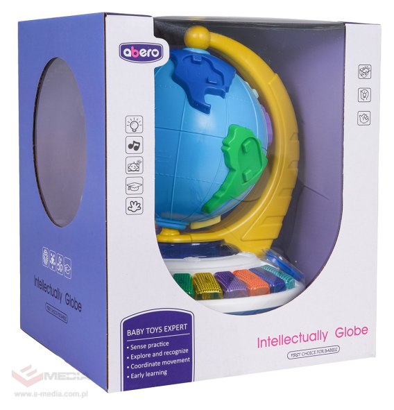 Interaktywny globus z funkcją dźwięku i światła dla dzieci od osiemnastego miesiąca życia. Zabawka edukacyjna wykonana została z najlepszej jakości materiałów w żywych kolorach. W części przedstawiającej kulę ziemską umiejscowiono wypukłe elementy imitujące kontynenty. Na każdym z kontynentów znajduje się wgłębienie na umiejscowienie przypinki z obrazkiem zwierzaka, jakie żyje na tym kontynencie. W zestawie mamy 7 kontynentów i 7 przypinek ze zwierzakami. Globus możemy obracać o 360 stopni wokół swojej stałej podstawy. Pod globusem znajduje się solidna podstawa, na której umiejscowiono wgłębienia na przypinki z obrazki zwierzątek (te same co przy kontynentach), pianinko z podświetleniem i kolorowymi klawiszami, książeczkę z przekładanymi kartkami oraz przekładankę z koralikami. Globus będzie idealnym narzędziem, aby zachęcić maluchy donauki i pokochania geografii. Pomoże dzieciom przez zabawę poznać kontynenty i ich umiejscowienie na kuli ziemskiej, zwierzęta, kształty i kolory. Ponadto rozwija umiejętności motoryczne, zmysł dotyku, zręczność, koordynację wzrokowo-ruchową i wyobraźnię. Zabawka zasilana jest bateriami typu 3 x AA 1,5 V (brak w zestawie).