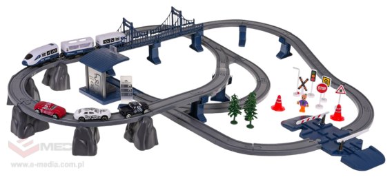 Bogato wyposażony zestaw tory kolejowe, pociąg i akcesoria dla dzieci od 3-go roku życia. Zestaw wykonany został z najlepszej jakości plastiku, jest solidny i wytrzymały. Zawiera aż 103 elementy: elementy konstrukcyjne dwupoziomowego toru, pociąg, stację z efektami dźwiękowymi i świetlnymi, most, szlaban, znaki drogowe, autka i figurkę chłopca. Stacja zasilana jest bateriami typu 3 x AG3 1,5 V (w zestawie), pociąg bateriami typu 2 x AAA 1,5 V (brak w zestawie).