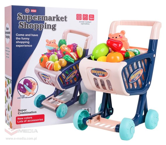 Duży wózek sklepowy z akcesoriami dla dzieci powyżej trzeciego roku życia. Zabawka wykonana została z najlepszej jakości plastiku, posiada wygodną rączkę do pchania i szerokie koła. Kolorowe warzywa i owoce imitują prawdziwe. Cały zestaw składa się z 36 elementów.