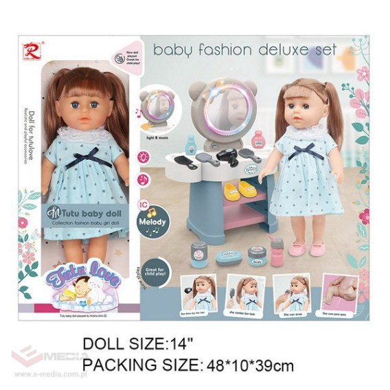Zestaw, interaktywna toaletka z lalką robiącą siusiu dla dzieci od 3-go roku życia. Toaletka wykonana została z najlepszej jakości plastiku, w żywych kolorach. Posiada podświetlane lustro, efekty dźwiękowe, blat na akcesoria i dwie półeczki. Laleczka dołączona do zestawu ma przyjemną w dotyku buzię, śliczne włosy, idealne do czesania, ruchome rączki i nóżki. Ubrana jest w sukienkę i butki. Lalka po napojeniu ją wodą, robi siusiu, na jej brzuszku znajduje się panel uruchamiający efekty dźwiękowe w postaci odgłosów płaczu, śmiechu, spania, marudzenia i innych wydawanych przez dziecko. W zestawie znaleźć możemy również pojemniczek do pojenia lali, mydelniczkę, pudełko na maść, pudełko na zasypkę, flakoniki z perfumami, pantofelki na zmianę, suszarkę, lusterko, grzebyk i szczotkę do włosów. Toaletka zasilana jest bateriami typu 4 x AA 1,5 V (brak w zestawie), lalka bateriami typu 3 x LR44 (w zestawie).