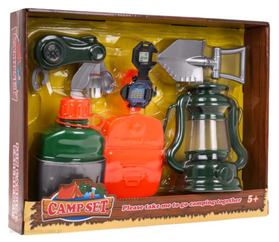 Zestaw kempingowy dla dzieci od 3-go roku życia. W skład zestawu wchodzi: lampa, manierka, niezbędnik, zegarek, pojemnik na żywność oraz łopatka. Z tym zestawem dziecko poczuje się jak prawdziwy odkrywca. Lampa zasilana jest bateriami typu 3 x AG13 (w zestawie).