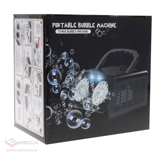Maszyna do robienia baniek, wytwornica z dwiema dyszami dla dzieci od 3-go roku życia, młodzieży i dorosłych. Wydajna wytwornica urozmaici każdą zabawę. Po podaniu specjalnego płynu lub wody z mydłem z dwóch dysz wydobywają się kolorowe bańki mydlane, a cichy wentylator zainstalowany w maszynie rozwiewa je dookoła. Dodatkowo bańki są podświetlane przez dwie diody znajdujące się przy dyszach. Wytwornica zasilana jest bateriami typu 4 x AA 1,5V, baterii brak w zestawie. Maszynę wyposażono w wygodną rączkę do przenoszenia.