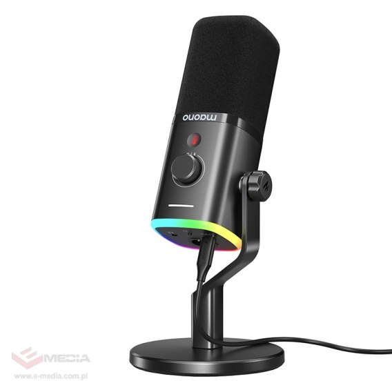 Mikrofon został wyposażony w jedno pokrętło do regulacji głośności mikrofonu i słuchawek, a także w dotykowy przycisk wyciszenia i sterowania oświetleniem RGB. Możesz także całkowicie wyłączyć podświetlenie.