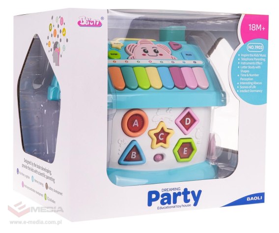 Interaktywny, edukacyjny domek dla dzieci od 18-go miesiąca życia. Domek wykonany został z najlepszej jakości plastiku, w żywych kolorach, przyciągających wzrok dziecka i zachęcających do edukacyjnej zabawy. Domek posiada 4 ściany oferujące różne atrakcje, różowy daszek oraz rączkę do przenoszenia. Zabawka zasilana jest bateriami typu 3 x AA 1,5 V (brak w zestawie). Do zestawu dołączone jest również niebieskie autko.