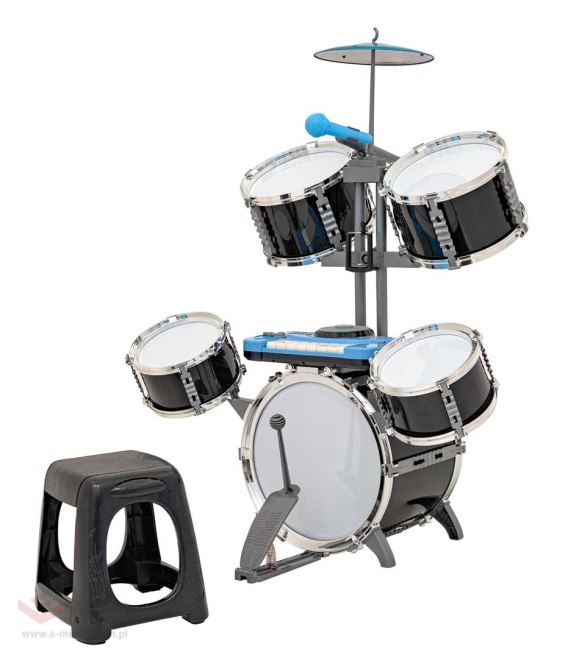 Duża czarna perkusja z keyboardem i mikrofonem w zestawie dla dzieci od 3-go roku życia. Perkusja wykonana została z bezpiecznych, wysokiej jakości materiałów. Z wyglądu przypomina profesjonalny instrument. Wyposażona jest w pięć bębnów, talerz, komplet pałeczek, mikrofon oraz keyboard. W zestawie znajduje się również taboret. Keyboard posiada wiele ciekawych funkcji takich jak mikser, wgrane melodie, wersję demo, możliwość nagrywania i odtwarzania, oraz wejście na mikrofon i MP3. Keyboard zasilany jest bateriami typu 4 x AA 1,5V (w zestawie). Zabawa tym zestawem rozwija umiejętności muzyczne, zmysł słuchu i uczy odróżniać dźwięki.