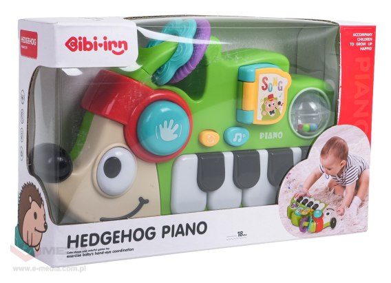 Pianinko o kształcie jeża dla maluszków od osiemnastego miesiąca życia. Zabawka wykonana została z najlepszej jakości materiałów i nie posiada ostrych zakończeń. Żywe kolory przyciągają uwagę dziecka i wzbudzają ciekawość. Pianinko posiada pięć białych klawiszy i cztery czarne. Nad klawiszami umiejscowiono przycisk ze zmianą trybu i włącznikiem melodii. Wyżej znajduje się książeczka do przekładania, bębenek, grzechotka z kolorowymi kuleczkami i gryzak.  Zabawka zasilana jest bateriami typu 3 x AAA 1,5V (brak w zestawie).