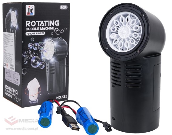 Przenośna maszyna do robienia baniek, wytwornica dla dzieci od trzeciego roku życia, młodzieży i dorosłych. Wydajna wytwornica urozmaici każdą zabawę. Z dyszy wydobywają się kolorowe bańki mydlane, a cichy wentylator zainstalowany w maszynie rozwiewa je dookoła. Dodatkowo bańki są podświetlane przez cztery diody znajdujące się naokoło dyszy. Na górze maszyny umiejscowiono przycisk odpowiedzialny za obroty, pojedyncze naciśnięcie powoduje, że maszyna będzie wolno się obracać o 90 stopni, podwójne naciśnięcie zaś obrót 180 stopni, potrójne naciśnięcie wyłącza obrót. Wytwornica zasilana jest akumulatorem typu 3,7V (w zestawie znajdują się dwa akumulatory).