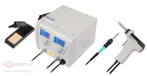 Dwa niezależne cyfrowe wyświetlacze pozwalają na jednoczesne monitorowanie temperatury lutownicy i rozlutownicy, co ułatwia kontrolę nad procesem pracy. Zintegrowana pompa o mocy 600 mmHg w rozlutownicy zapewnia skuteczne usuwanie nadmiaru lutowia. W zestawie znajdują się również zapasowe groty, filtry oraz wyciory, które umożliwiają długotrwałe użytkowanie bez konieczności częstych zakupów dodatkowych akcesoriów.