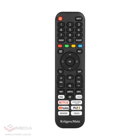 Dołączony do telewizora Kruger&Matz pilot został zaprojektowany z myślą o wygodnym i intuicyjnym użytkowaniu. Na pilocie znajdują się skróty do najpopularniejszych aplikacji, takich jak Netflix, YouTube czy Amazon Prime Video. Dzięki nim możesz szybko uruchomić ulubione treści bez konieczności przeglądania menu czy wyszukiwania aplikacji.