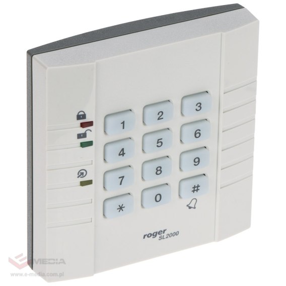 Roger SL2000B to wewnętrzny zamek szyfrowy identyfikujący użytkowników kodem PIN, z możliwością zaprogramowania do 55 kodów użytkowników oraz kodu Głównego i Administratora. Do sterowania drzwiami dostępne jest wyjście przekaźnikowe NO/NC (np. dla elektrozaczepu lub zwory), dwa wyjścia tranzystorowe (Bell i Switch) oraz wejścia dla przycisku wyjścia i czujnika otwarcia drzwi, a stan pracy sygnalizują diody i buzzer; przewidziano też zabezpieczenie antysabotażowe (tamper). Zasilanie 10-15V DC i nieulotna pamięć umożliwiają pracę autonomiczną.
