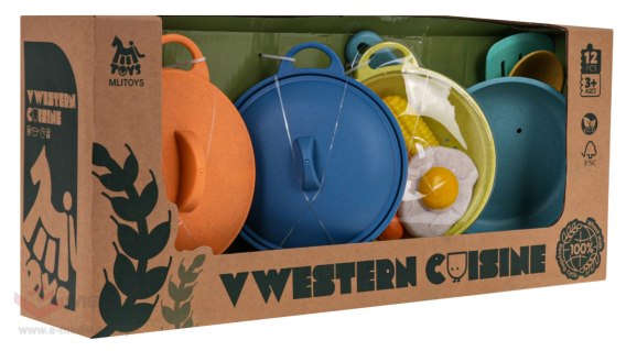 Zestaw garnków wykonanych z Bioplastiku, dla dziecka od  3-go roku życia. Zestaw składa się z 12 elementów w różnych kolorach. Mamy patelnię, dwa garnki z pokrywką, cedzak, łopatkę, łyżkę oraz atrapy produktów spożywczych takie jak jajko sadzone, nóżka z kurczaka, marchewka, kukurydza. Ten zestaw daje nieograniczone możliwości zabawy. Materiał, z którego wykonany jest zestaw, jest przyjazny dla dziecka i środowiska naturalnego.