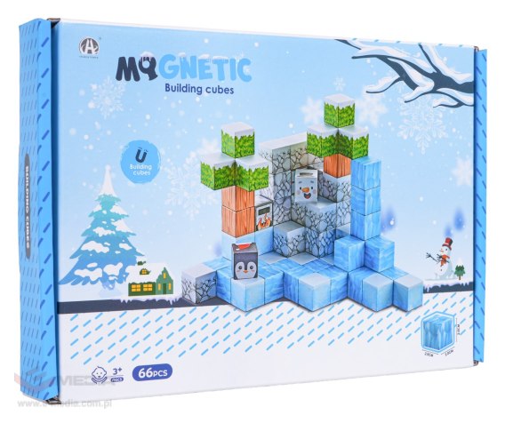 Zestaw 66 kolorowych klocków, magnetycznych kostek 3D dla dzieci od trzeciego roku życia. Klocki magnetyczne wykonano z najlepszej jakości materiałów w żywych kolorach z rysunkami o tematyce zimowej. Kostki imitują lód, rośliny, drewno czy bałwanka lub pingwinka. Można z nich zbudować różne konstrukcje. Magnesy neodymowe bardzo solidnie trzymają, tworząc stabilną konstrukcję. Układanie klocków uczy logicznego myślenia i ćwiczy rączki dzieci.