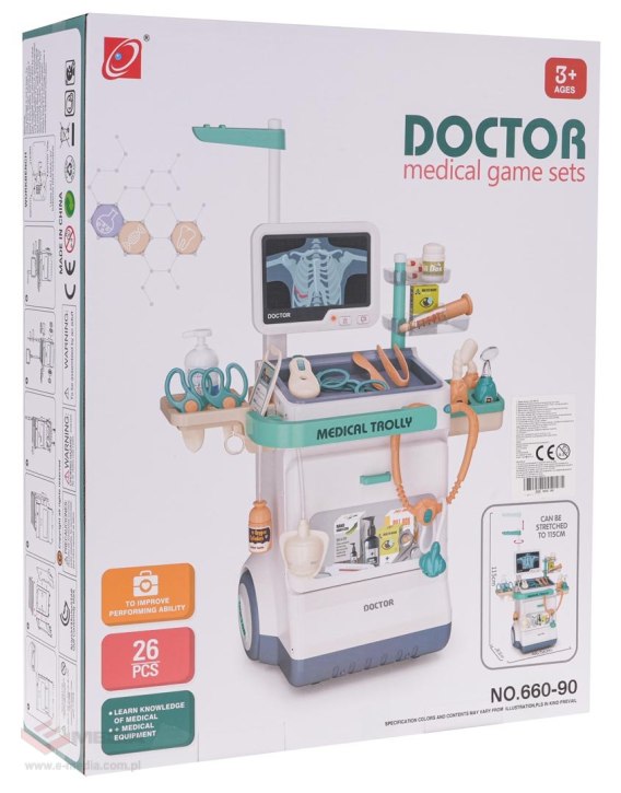 Interaktywny, bogato wyposażony zestaw lekarski z efektami dźwiękowymi i świetlnymi, dla dzieci od 3-go roku życia. Zestaw składa się z solidnie wykonanego, lekkiego wózka, z dużymi kółeczkami i poręcznym uchwytem i mnóstwa narzędzi lekarskich. Z tym zestawem dziecko może się wcielić w rolę lekarza, okulisty, kardiologa czy dentysty. Możemy wymieniać zdjęcia RTG czy EKG, na ekranie monitorującym za pomocą przycisków można aktywować odgłosy bicia serca, czy alarmu. Panel monitorujący zasilany jest bateriami typu 2 X AAA 1,5 V (brak w zestawie).