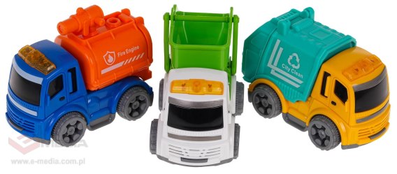 Zestaw pojazdów służ miejskich dla dzieci od 3-go roku życia. Pojazdy wykonane zostały z najlepszej jakości plastiku w żywych kolorach zachęcających dziecko do zabawy. Wiernie odwzorowują te duże, znane z ulic miast. Pojazdy posiadają ruchome elementy i są niewielkiego gabarytu, co sprawia, że można je zabrać wszędzie ze sobą. W zestawie znajduje się śmieciarka, auto do przewozu gruz oraz auto Straży Pożarnej.