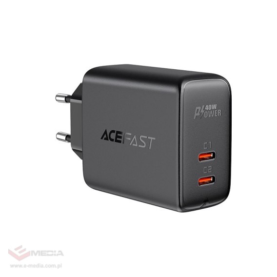 Szybka ładowarka sieciowa marki Acefast. Posiada 2 porty USB Typ C, które umożliwiają ładowanie z mocą do 20W (łącznie 40W). Pozwala na szybkie ładowanie dwóch urządzeń jednocześnie m.in. w standardach PPS, Power Delivery 20W, Quick Charge 3.0, AFC i FCP. Jest wykonana z ognioodpornego materiału PC. Została wyposażona w wiele zabezpieczeń takich jak np. przed przegrzaniem, przepięciem, wysokim napięciem czy przeciążeniem.