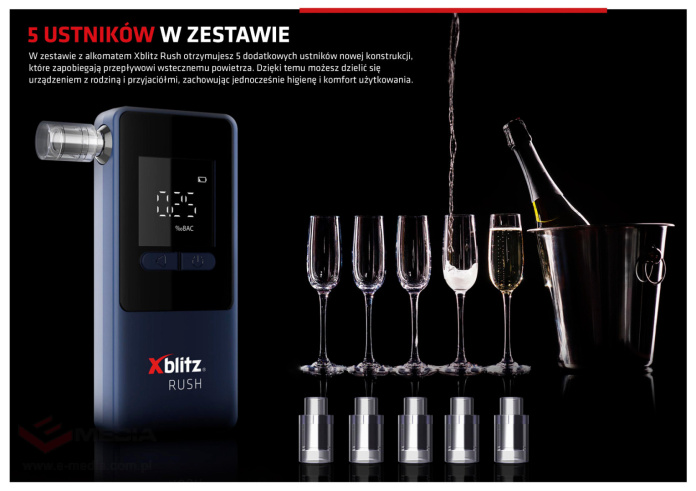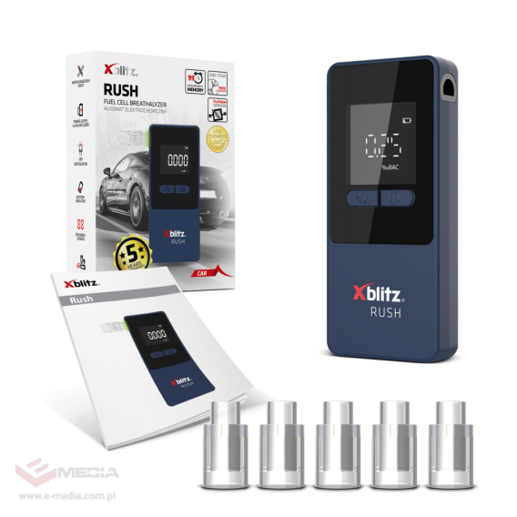 Alkomat Xblitz Rush z platynowym sensorem jest gotowy do pomiaru w zaledwie 5 sekund. Został wyposażony w czytelny wyświetlacz LED, wskaźnik naładowania baterii oraz pamięć, która przechowuje aż 99 ostatnich wyników. W zestawie z urządzeniem znajduje się 5 ustników oraz 2 baterie AAA, dzięki czemu jest ono gotowe do użycia od razu po zakupie.