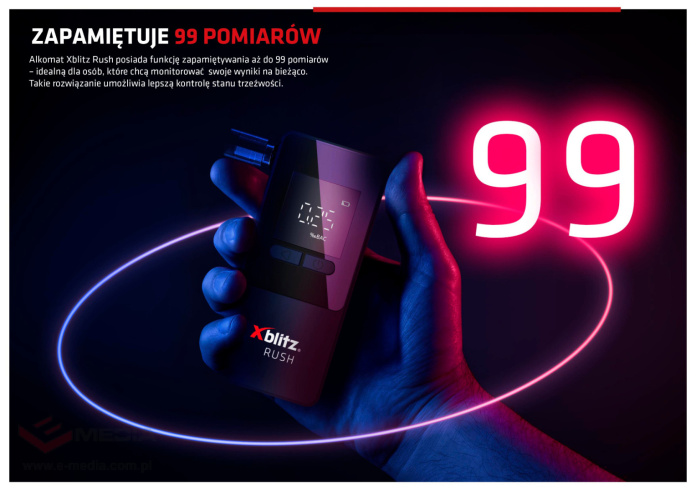 Alkomat Xblitz Rush posiada funkcję zapamiętywania aż do 99 pomiarów – idealną dla osób, które chcą monitorować swoje wyniki na bieżąco. Takie rozwiązanie umożliwia lepszą kontrolę stanu trzeźwości.