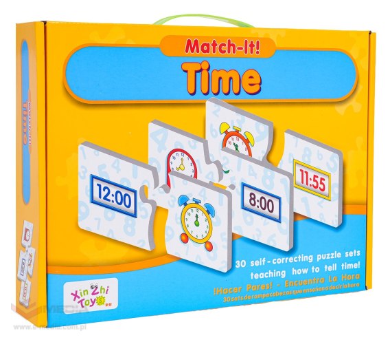 Gra edukacyjna z nauką zegara dla dzieci od trzeciego roku życia. Gra składa się z 60 puzzli, dzięki którym dziecko poznaje czas i uczy się dopasowywać kształty. Gra trenuje również koordynację ręka-oko, rozwija spostrzegawczość i koncentrację.Z jednej strony mamy rysunek zegara, a z drugiej czas zapisany w formie cyfrowej. Dziecko musi dopasować jeden element do drugiego. Gra idealnie łączy w sobie naukę i zabawę.