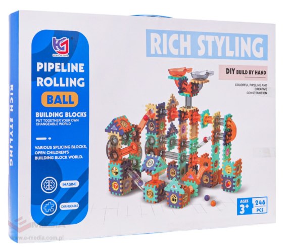 Ogromny zestaw klocków z zaczepami, torem i piłką dla dzieci od 3-go roku życia. Zestaw składa się z 246 elementów, z których zbudować możemy konstrukcję toru dla piłki. W instrukcji znajduje się przykładowa konstrukcja, ale dziecko stworzyć może również budowle według własnego pomysłu, co rozwija kreatywność i logiczne myślenie. Zestaw wykonany jest z najlepszej jakości plastiku w żywych kolorach przyciągających wzrok dziecka. Na klockach z zaczepami, nakleić możemy kolorowe obrazki. Zaczepy dobrze trzymają, a cała konstrukcja jest niezwykle stabilna. Po zbudowaniu konstrukcji należy górnymi lejkami włożyć piłeczkę, a ona poleci w dół, pokonując liczne zakręty. Obserwowanie toczącej się piłeczki jest niezwykle uspokajające i relaksujące.