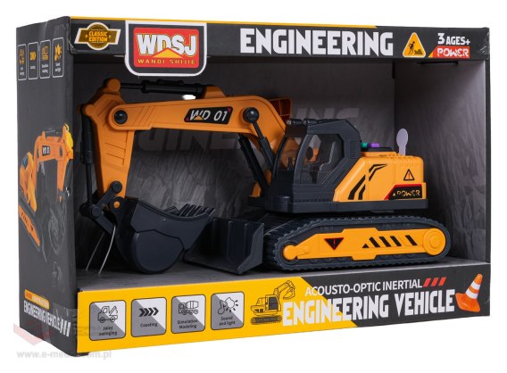 Interaktywna koparka z funkcją dźwięku i światła oraz ruchomymi elementami dla dzieci od trzeciego roku życia. Koparka wykonana została w skali 1:18 z najlepszej jakości materiałów i z dbałością o szczegóły. Zabawka posiada ruchome elementy takie jak łyżka czy podstawa. Na dachu maszyny budowlanej znajduje się panel z przyciskami, które uruchamiają efekty dźwiękowe i świetlne. Zabawka zasilana jest bateriami typu 3 x AG13 (w zestawie).