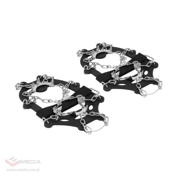 Raczki wyposażone są w 19 stalowych kolców o wysokości 14 mm, co zapewnia doskonałą przyczepność na śliskich powierzchniach. Kolce oraz łańcuchy wykonane są ze stali nierdzewnej, co gwarantuje ich odporność na korozję i trwałość. Silikonowa obejma jest elastyczna i dopasowuje się do różnych rozmiarów butów, zapewniając stabilność i komfort noszenia.