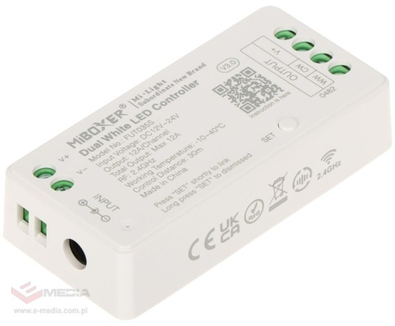 Sterownik oświetlenia FUT035S przeznaczony jest do kontrolowania załączenia, jasności świecenia oraz temperatury barwowej dwukanałowych białych taśm LED CCT (Corelated Color Temperature)